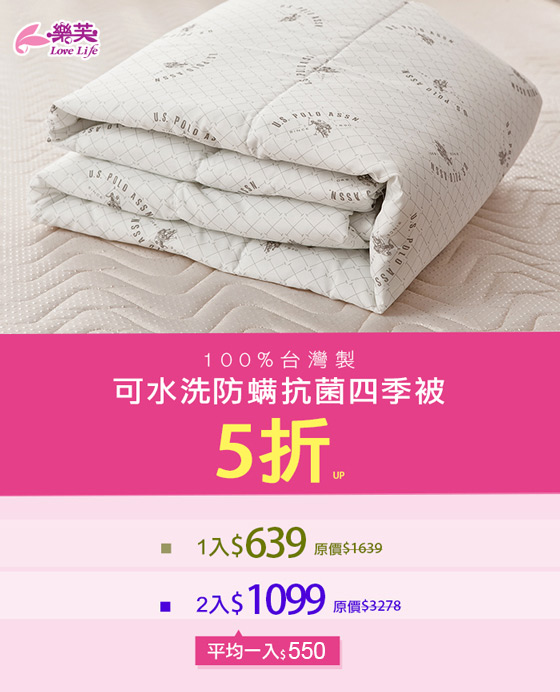 平均最低只要550元起(含運)即可享有100%台灣製可水洗防螨抗菌四季被1入/2入。